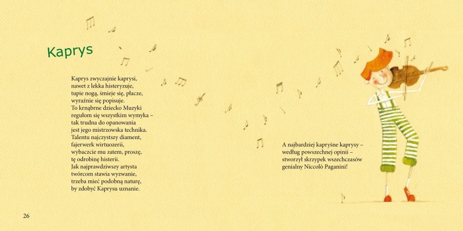 Legenda, fantazja, żart? Wszyscy znamy te słowa, ale nie wszyscy wiemy, że są one również utworami muzycznymi! Zatem… czy moment trwa tylko moment, a kaprys zwyczajnie kaprysi? Barkarolę wymyślił dziadek Karola, a romans stworzył Roman S.? Tego wszystkiego dowiesz się z lektury dowcipnych i zaskakujących skojarzeniami wierszy, a słuchając płyty poznasz słynne dzieła muzyczne, reprezentujące opisany rodzaj utworu.