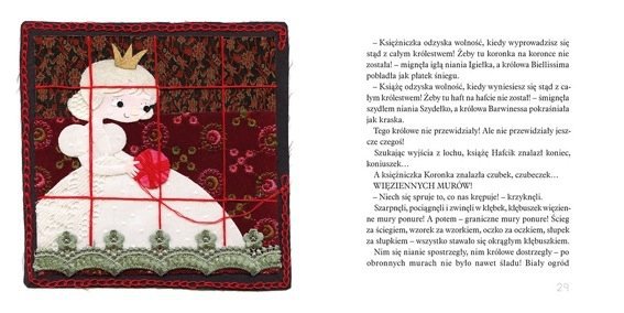 To bajka o miłości, nienawiści i tolerancji napisana rytmizowaną prozą. Sąsiadujące ze sobą królestwa kolorowych haftów i białych koronek to ogień i woda, tęcza i biel, tropik i mróz. Różnią się wszystkim, toteż nienawidzą się ich władczynie – Barwinessa i Biellissima, toczące ze sobą nieustającą wojnę. Piękno różnic potrafią natomiast docenić ich dzieci – tęczowy książę Hafcik bez pamięci zakochuje się w śnieżnobiałej księżniczce Koronce. Czy miłość młodych skruszy graniczne mury i wzruszy zimne serca matek?