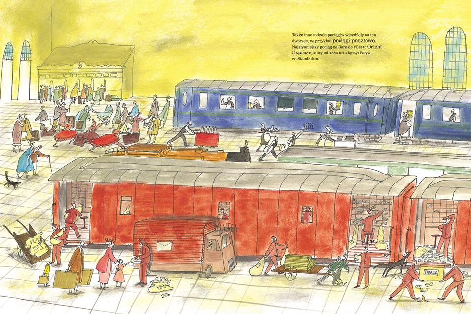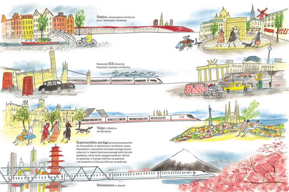 „Wielka księga pociągów” przybliża historię kolei od pierwszych lokomotyw parowych w Anglii po superszybkie pociągi w Japonii. Dzięki tej książce dowiesz się o pociągach kontenerowych w Stanach Zjednoczonych i linii transkontynentalnej przez Chiny i Rosję. Zobaczysz zajezdnię kolejową i luksusowe wnętrza królewskiej salonki. Poczujesz zawrót głowy podczas przeprawy przez strome góry, radość z przejażdżki elektryczną kolejką na plażę i... senność w czasie podróży kuszetką.